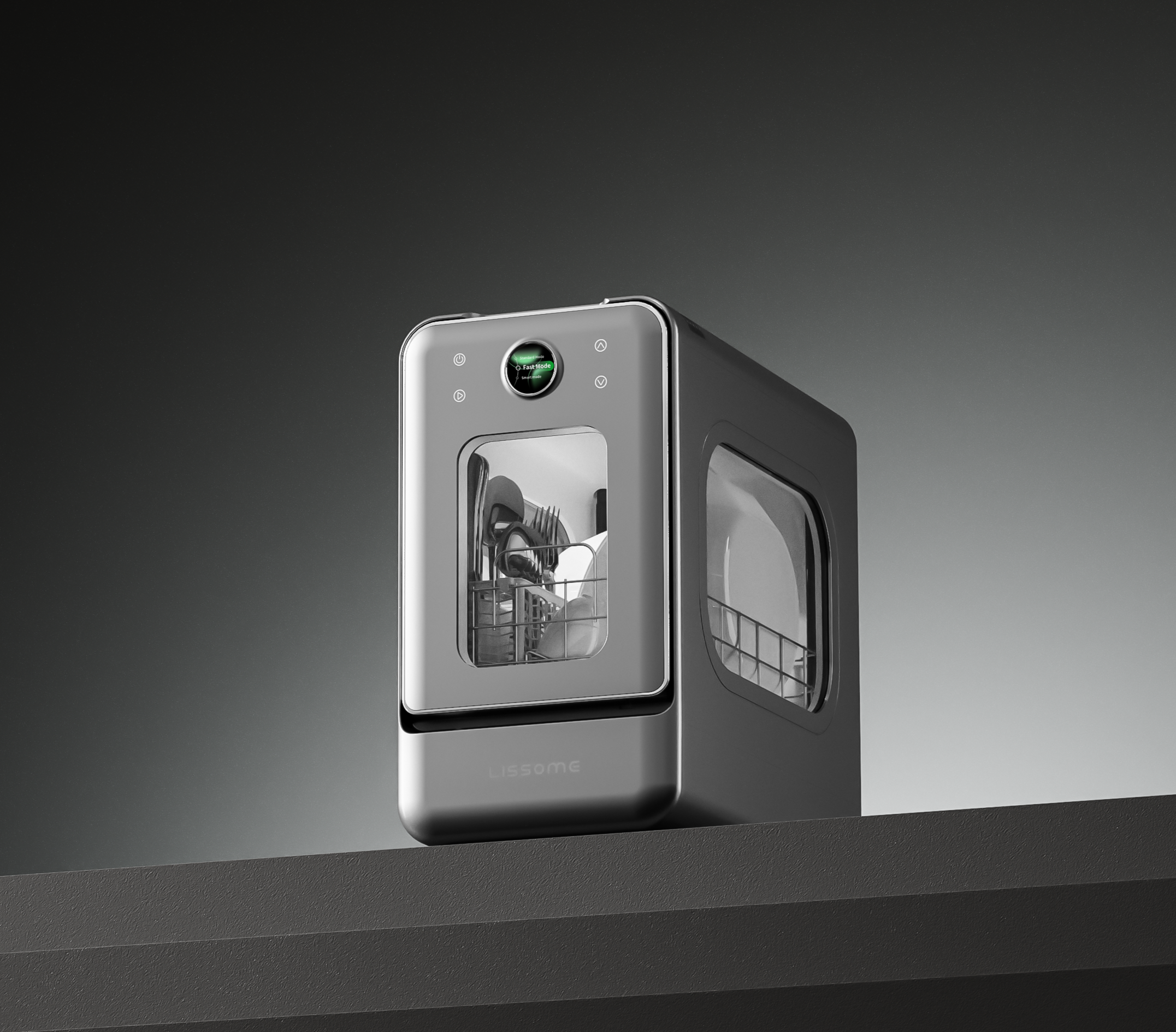 The LISSOME team and professional design company yifeeling began to work on the industrial design of R1. The structure of Rain is attractive and bright, like a gentle sun shower. The rounded edges and smooth sides create a reflective effect and a delicate sheen. The three transparent windows of Rain display the tableware within sight. Raindrops are etched on the glass door of the dishwasher.